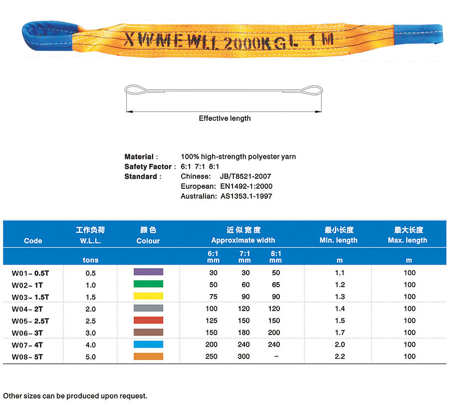 Synthetic fabric lifting belt (hereinafter refers to lifting belt) is a kind of soft lifting belt made of non-metallic materials and successor production of wire rope and chain in the lifting industry which is lighter and more convenient than similar metal and can solve the difficult problems such as large tonnage but small lifting space in the lifting process. The lifting belt is light, convenient and durable. Additionally, it has a noticeable earthquake effect, non-conductive performance, anti-corrosion and protects hanging items from being scratched. Many fracture experiments proved that lifting belt almost inflict zero reverse damage to metallic rope chain. The lifting belt adopts international standard colors to distinguish carrying tonnage. In the application process, carry tonnage can be distinguished by lifting belt jacket color if label on lifting belt wears Synthetic fabric lifting belt was used worldwide in the early days and has an application history spanning over fifty years. After being popularized in China for more than twenty years, it has gradually replaced wire rope rigging and chain rigging in many industries.