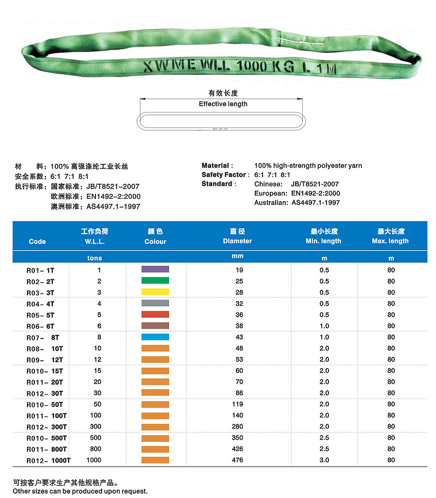 合成纖維吊裝帶(以下簡稱吊裝帶)為軟吊裝帶,采用非金屬原料,屬吊裝行業(yè)中鋼繩、鏈條的換代產(chǎn)品,比同類金屬繩相對輕便。能解決實際吊裝過程中大噸位、小吊裝空間的吊裝難題。吊裝帶有輕便、使用壽命長、減震性能好、不導電、不易腐蝕、保護被吊物品不被刮傷等特點。多次的斷裂試驗表明,吊裝帶相對于金屬繩鏈產(chǎn)生的反向傷害幾乎為零。吊裝帶采用國際標準色來區(qū)分承載噸位,在使用過程中,吊帶裝上的標簽磨損后,可能過吊裝帶外套的顏色來識別承重重量。合成纖維吊裝帶在國際上起步較早,至今已有著五十多年的應用歷史,在經(jīng)過二十多年的國內(nèi)推廣應用,以其獨有的顯著優(yōu)勢,早許多行業(yè)正逐步替代鋼絲繩索具和鏈條索具。
