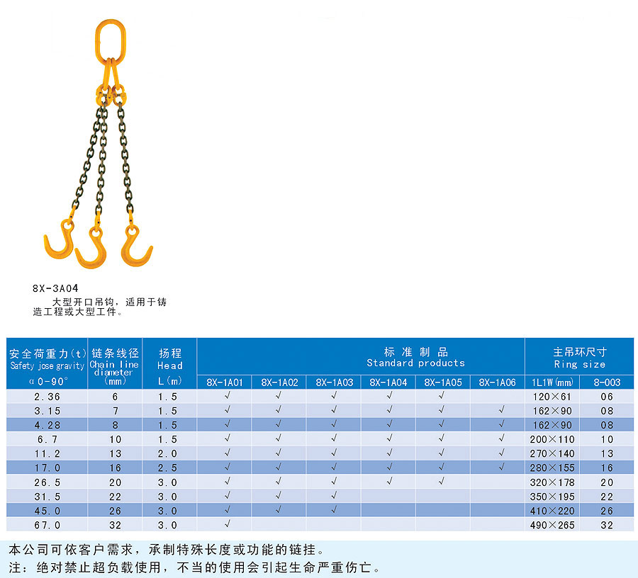 鏈條索具是以金屬鏈環(huán)連接而成的索具,按其形式分主要有焊接和組裝兩種,按其構(gòu)造分有單肢和多肢等,采用的是優(yōu)質(zhì)合金鋼,耐磨性好、強度高、使用壽命長、易彎曲。適合大規(guī)模、頻繁使用的場合;其還具有耐輻射高溫(-40~223℃)的特點,亦適用于熱鋼胚、卷鋼的吊運。靈活的多肢、多種組合形式,可提高工作效率,降低成本。