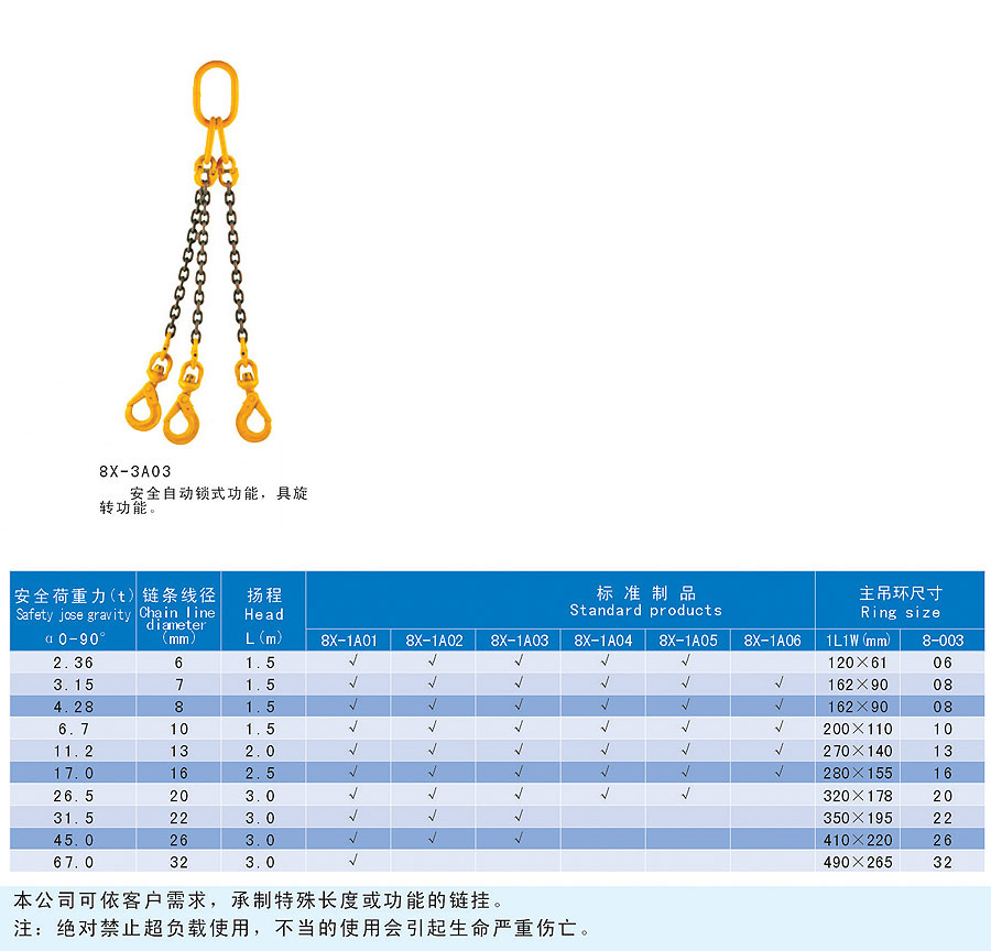 鏈條索具是以金屬鏈環(huán)連接而成的索具,按其形式分主要有焊接和組裝兩種,按其構(gòu)造分有單肢和多肢等,采用的是優(yōu)質(zhì)合金鋼,耐磨性好、強(qiáng)度高、使用壽命長(zhǎng)、易彎曲。適合大規(guī)模、頻繁使用的場(chǎng)合;其還具有耐輻射高溫(-40~222℃)的特點(diǎn),亦適用于熱鋼胚、卷鋼的吊運(yùn)。靈活的多肢、多種組合形式,可提高工作效率,降低成本。