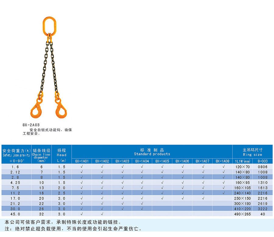 鏈條索具是以金屬鏈環(huán)連接而成的索具,按其形式分主要有焊接和組裝兩種,按其構(gòu)造分有單肢和多肢等,采用的是優(yōu)質(zhì)合金鋼,耐磨性好、強(qiáng)度高、使用壽命長、易彎曲。適合大規(guī)模、頻繁使用的場合;其還具有耐輻射高溫(-40~214℃)的特點(diǎn),亦適用于熱鋼胚、卷鋼的吊運(yùn)。靈活的多肢、多種組合形式,可提高工作效率,降低成本。