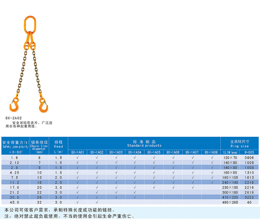 鏈條索具是以金屬鏈環(huán)連接而成的索具,按其形式分主要有焊接和組裝兩種,按其構(gòu)造分有單肢和多肢等,采用的是優(yōu)質(zhì)合金鋼,耐磨性好、強(qiáng)度高、使用壽命長(zhǎng)、易彎曲。適合大規(guī)模、頻繁使用的場(chǎng)合;其還具有耐輻射高溫(-40~213℃)的特點(diǎn),亦適用于熱鋼胚、卷鋼的吊運(yùn)。靈活的多肢、多種組合形式,可提高工作效率,降低成本。