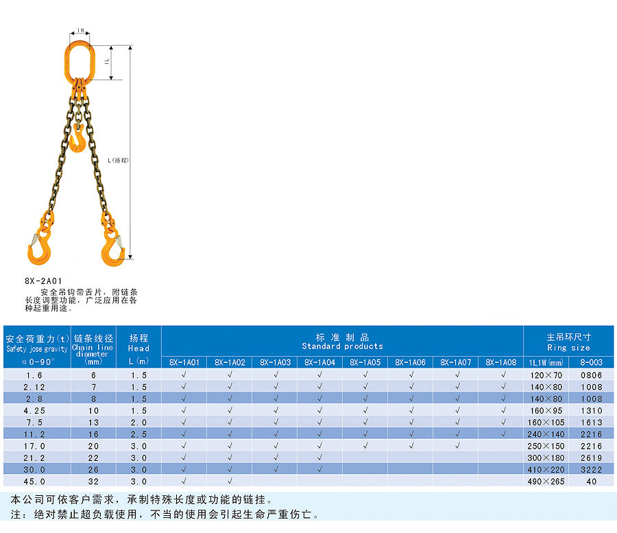 鏈條索具是以金屬鏈環(huán)連接而成的索具,按其形式分主要有焊接和組裝兩種,按其構造分有單肢和多肢等,采用的是優(yōu)質合金鋼,耐磨性好、強度高、使用壽命長、易彎曲。適合大規(guī)模、頻繁使用的場合;其還具有耐輻射高溫(-40~212℃)的特點,亦適用于熱鋼胚、卷鋼的吊運。靈活的多肢、多種組合形式,可提高工作效率,降低成本。