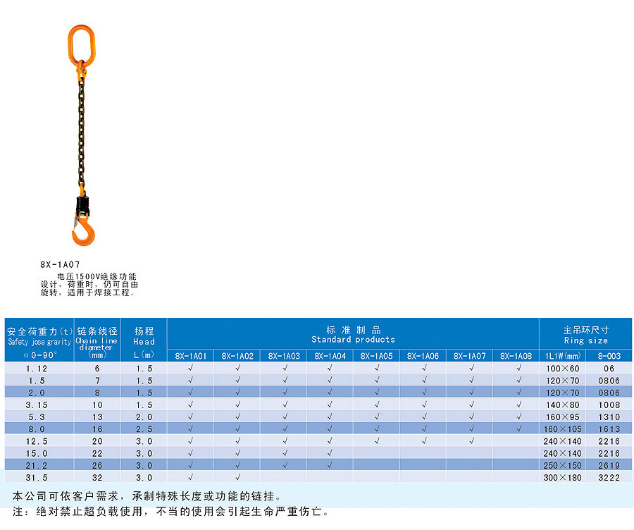 鏈條索具是以金屬鏈環(huán)連接而成的索具,按其形式分主要有焊接和組裝兩種,按其構(gòu)造分有單肢和多肢等,采用的是優(yōu)質(zhì)合金鋼,耐磨性好、強(qiáng)度高、使用壽命長(zhǎng)、易彎曲。適合大規(guī)模、頻繁使用的場(chǎng)合;其還具有耐輻射高溫(-40~210℃)的特點(diǎn),亦適用于熱鋼胚、卷鋼的吊運(yùn)。靈活的多肢、多種組合形式,可提高工作效率,降低成本。