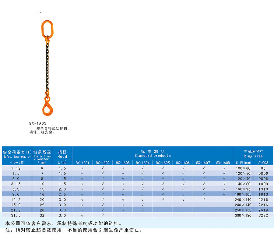鏈條索具是以金屬鏈環(huán)連接而成的索具,按其形式分主要有焊接和組裝兩種,按其構造分有單肢和多肢等,采用的是優(yōu)質合金鋼,耐磨性好、強度高、使用壽命長、易彎曲。適合大規(guī)模、頻繁使用的場合;其還具有耐輻射高溫(-40~206℃)的特點,亦適用于熱鋼胚、卷鋼的吊運。靈活的多肢、多種組合形式,可提高工作效率,降低成本。