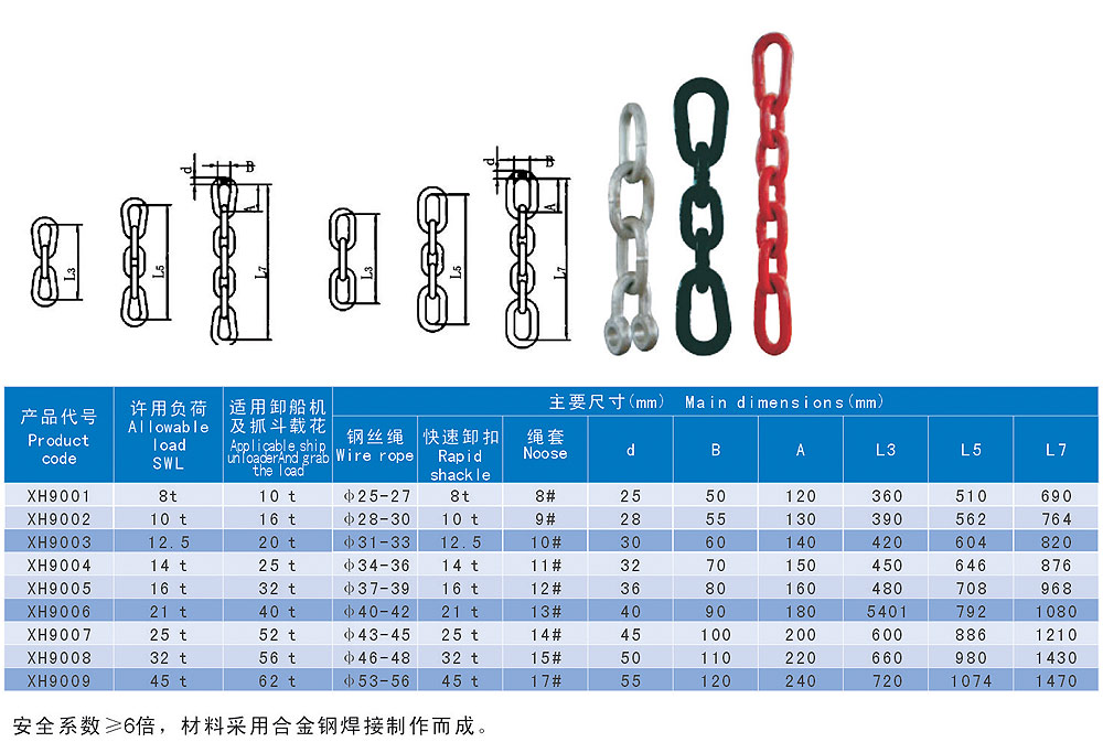 鏈條索具是以金屬鏈環(huán)連接而成的索具,按其形式分主要有焊接和組裝兩種,按其構造分有單肢和多肢等,采用的是優(yōu)質合金鋼,耐磨性好、強度高、使用壽命長、易彎曲。適合大規(guī)模、頻繁使用的場合;其還具有耐輻射高溫(-40~203℃)的特點,亦適用于熱鋼胚、卷鋼的吊運。靈活的多肢、多種組合形式,可提高工作效率,降低成本。